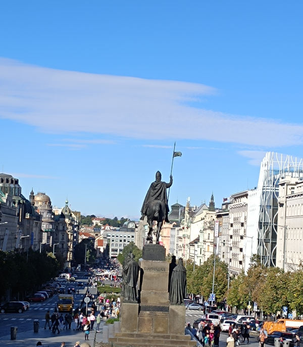 Nuestra siguiente parada fue en las Galerías Lucerna, para ver otra de las famosas esculturas de David Černý, la escultura del Caballo al revés. Después fuimos a ver la estatua de San Wenceslao, que es la que parodió el escultor con su obra, en la plaza con su mismo nombre. La plaza de San Wenceslao no es una plaza en el sentido tradicional, en realidad tiene más la forma de un bulevar largo y amplio, lleno de tiendas, hoteles y restaurantes. Es un lugar muy animado, con un gran valor histórico y cultural. Si subes las escaleras del Museo Nacional, podrás ver toda la plaza desde arriba.