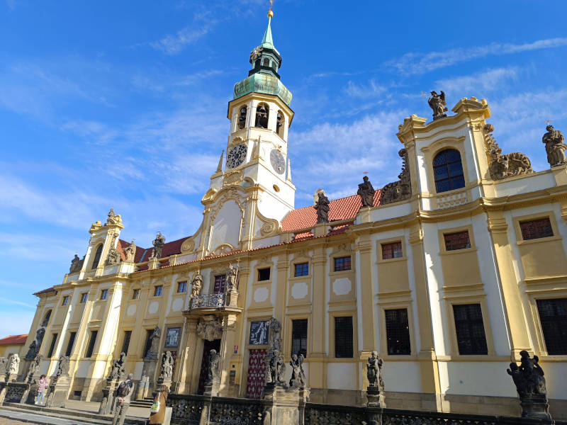 Para bajar desde el monasterio hacia el castillo, puedes pasar por la calle Novy svet, que por algún motivo tiene menos tránsito de turistas y se respira mucha tranquilidad. Desde ahí llegamos a la plaza Loreto, donde está el Santuario de Loreto de Praga, una preciosa iglesia barroca.