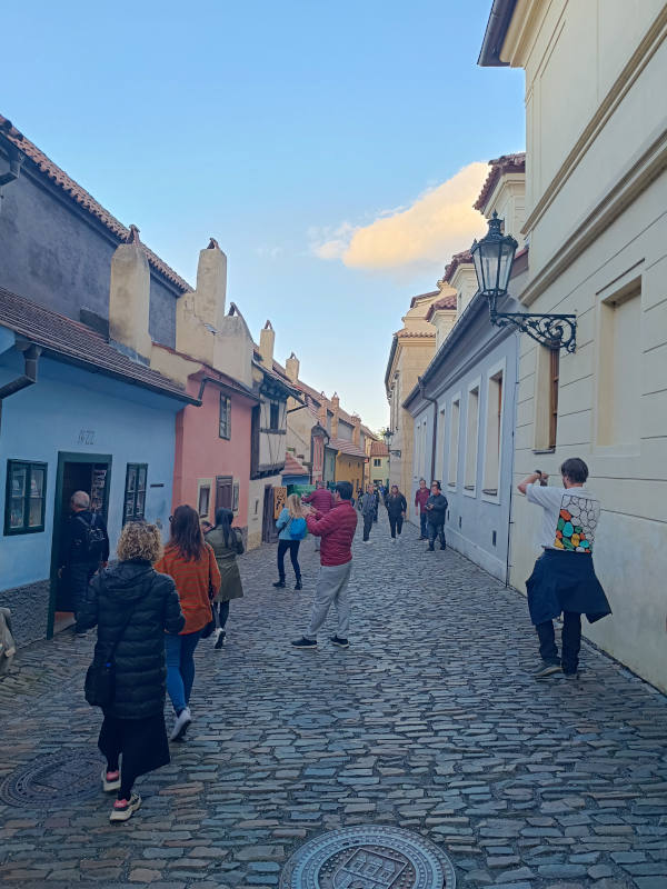 Eran ya casi las cinco, así que subimos corriendo las escaleras hasta el castillo para poder entrar al callejón de oro gratis. Había bastante gente apelotonada fuera esperando como nosotras y, cuando abrieron los tornos (sí, tornos, has leído bien, parecía la entrada a un supermercado), entramos todos en masa, como si de unas grandes rebajas se tratara. Te recomiendo que vayas un poco más tarde, en lugar de a las 17.00 en punto, porque en diez minutos ya casi no quedaba nadie en el callejón. Una vez dentro, pudimos ver sus casas estrechas y pintorescas, incluyendo la número 22, también conocida como la casa de Franz Kafka, porque el escritor vivió ahí durante un tiempo en 1916.