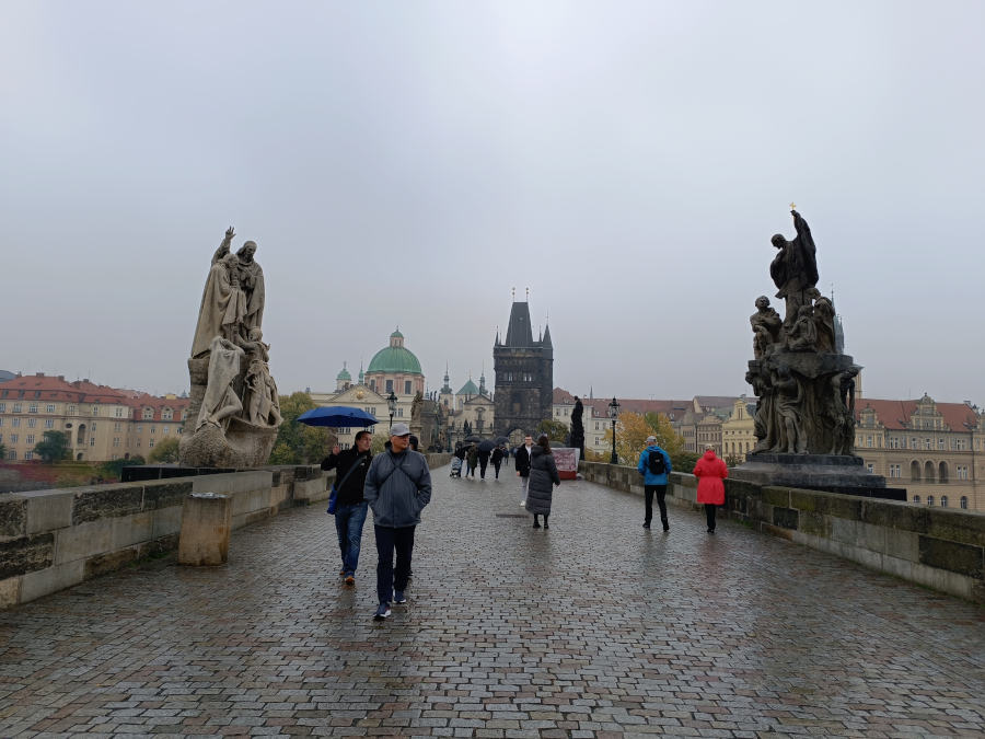 Al día siguiente empezamos nuestro primer día de visita en Praga con algo de lluvia ligera, pero gracias a eso pudimos ver el puente de Carlos con muy poca gente y un ambiente algo misterioso por la niebla. Vimos tranquilamente todas las estatuas del puente y aprovechamos para tocar la de San Juan Nepomuceno. Cuenta la leyenda que, si quieres volver a Praga, debes tocar la cruz del escudo, aunque otros dicen que hay que tocar la imagen del santo. También hay quien dice que lo que hay que tocar es la imagen del perro y así atraerás buena suerte. Nosotras, por si acaso, frotamos todas las figuras en las zonas ya brillantes de tanto roce. Menos mal que ya no estamos en pandemia….