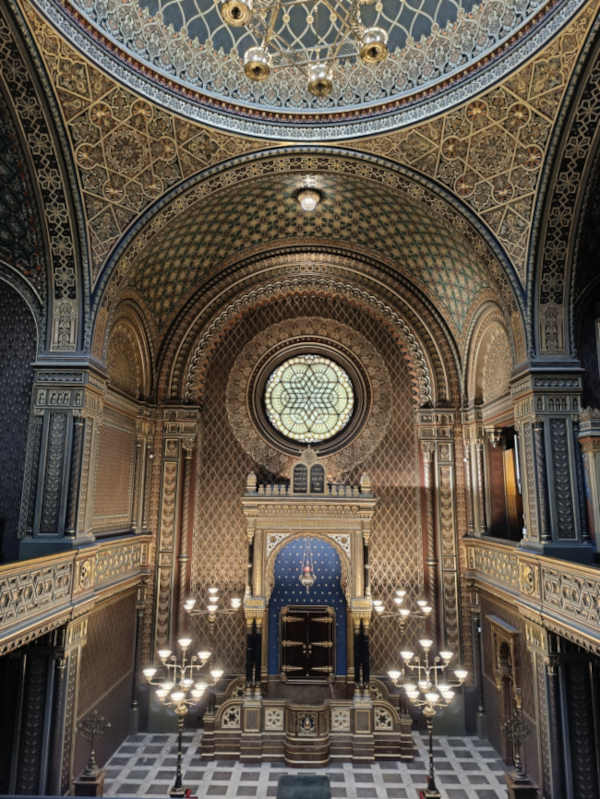 Durante el free tour habíamos visto el barrio judío, pero no habíamos llegado a entrar en el cementerio, así que después del tredelnik fuimos a comprar las entradas. Normalmente es mejor comprar las entradas en las sinagogas que en el cementerio, porque son entradas conjuntas y suele haber menos cola. Hay tres entradas diferentes, según lo que quieras visitar. Escogimos la entrada Jewish Museum in Prague (400 CZK por persona), porque incluía lo que más nos interesaba: la Sinagoga Española y el Cementerio. También incluye la visita a las sinagogas Maisel, Pinkas y Klausen, pero la que realmente nos impresionó fue la Sinagoga Española. Se llama así porque fue construida por la comunidad judía sefardí que se estableció en Praga, después de ser expulsada de España durante la Inquisición, es de estilo mudéjar y realmente preciosa.