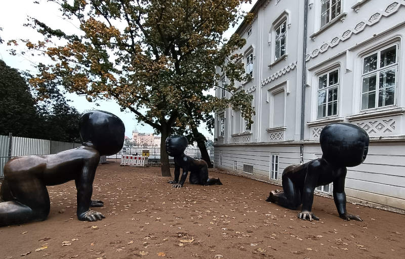 Después de comer, cruzamos el puente de Carlos para visitar la Isla Kampa, que en realidad no es una isla, sino que está conectada al continente. Sin embargo, históricamente, estaba formada por una serie de canales que fluían alrededor de ella, creando una sensación de aislamiento y por eso pasó a llamarse isla. Además de ser una zona muy agradable y pintoresca, tiene bonitas vistas del puente y otras zonas de Praga. Allí pudimos ver dos de las esculturas de David Černý más famosas de Praga, de las que te hablaré con detalle en este post: la estación de los bebés, con tres bebés gigantes gateando, y la de los dos hombres haciendo pis, enfrente del museo Kafka.
