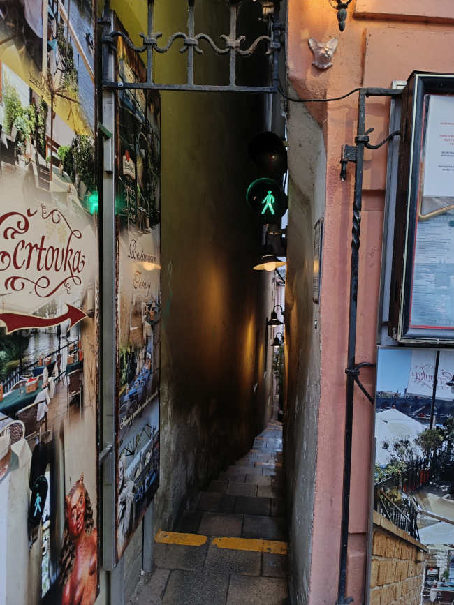 Muy cerca de la Isla Kampa, en el barrio de Mala Strana, fuimos a ver el muro de John Lennon, cubierto de coloridos grafitis y mensajes relacionados con John Lennon y la paz, que nunca son iguales porque se van añadiendo nuevos constantemente. Allí nos hicimos el reportaje fotográfico de rigor y nos marchamos a visitar el que se supone que es el callejón más estrecho del mundo, Vinárna Čertovka. Es tan estrecho que no pasan dos personas a la vez y se ha hecho tan famoso que tuvieron que instalar un semáforo, para regular la circulación de los peatones, aunque realmente no lleva más que a un restaurante. Me imagino que el restaurante estará encantado con la popularidad que ha ganado su callejón.