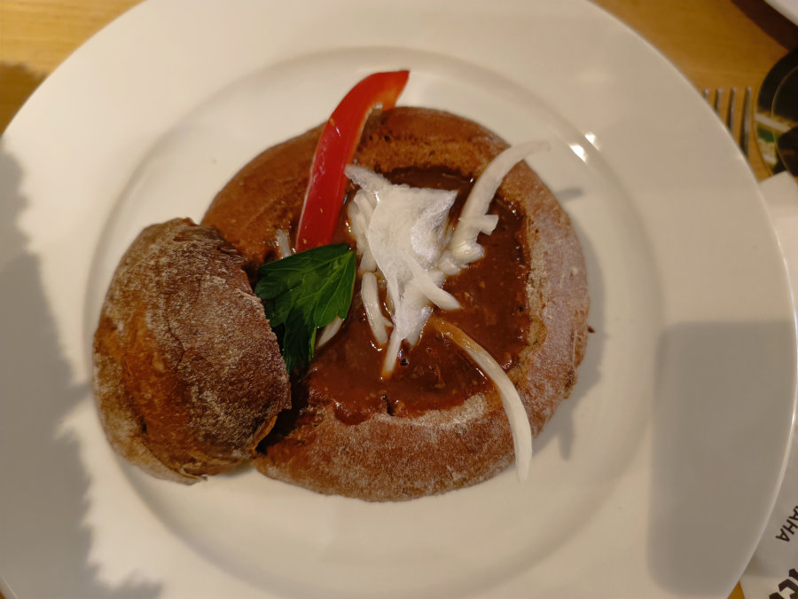 Esta vez estábamos decididas a comer en U Glavicu y por fin conseguimos mesa, aunque estaba cerca de la puerta, que dejan abierta para servir las mesas de fuera. Entraba bastante fresco, así que pedimos que nos encendieran el calefactor de encima de la mesa, se ve que están bien preparados para el frío. Queríamos terminar de probar los platos más típicos, así que pedimos varios para compartir: goulash dentro de un pan redondito, snitzel de cerdo, queso frito, salchichas, jamón de Praga y una ensalada mixta, en un intento de meter algo verde en la comilona. Lo que no conseguí fue que se animara ninguna a probar el steak tartar, que me encanta y es también bastante típico en Praga. El total de la comida para las cinco fueron 1.925 CZK (78€)