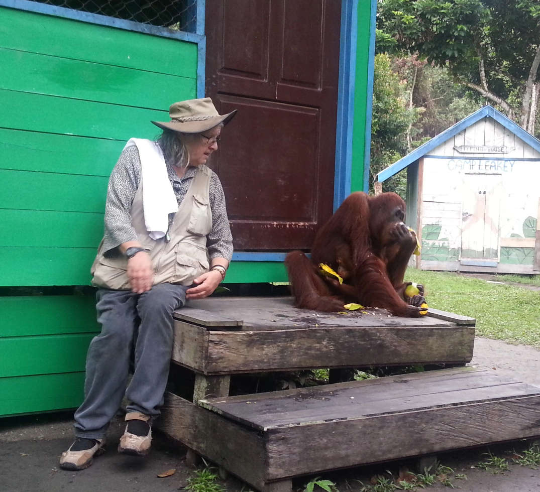 Algo más tarde llegamos a la última estación, el campamento Leakey. Es el centro de investigación y rehabilitación de orangutanes donde Birutte Galdikas comenzó a estudiar los orangutanes en 1971, con el apoyo de Louis Leakey y el patrocinio de la National Geographic Society. De ahí el nombre del campamento, Camp Leakey, en honor de su mentor. Hoy en día, Birutte está considerada como la mayor experta en el comportamiento de los orangutanes y,​ en un viaje anterior a Borneo, tuve la enorme suerte de coincidir con ella misma en persona.