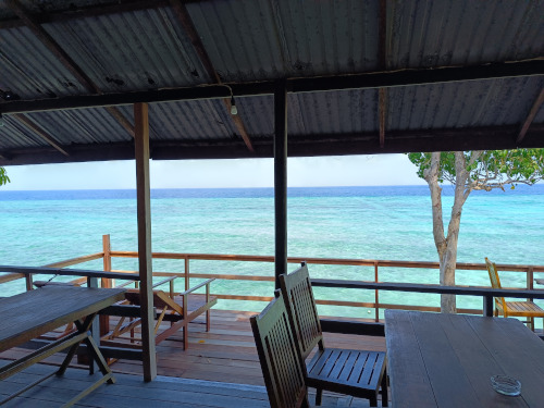 Habíamos escogido la diminuta isla Maratua, en lugar de la isla Derawan, porque es mucho más tranquila y menos concurrida. De hecho, cuando llegamos a nuestro alojamiento, Maratua Guesthouse, resultó que éramos los únicos alojados en esas fechas. Es un pequeño establecimiento familiar, así que nos recibieron los mismos dueños, Jun y Anne, con un zumo recién hecho. Nos enseñaron nuestra cabaña y cómo funcionaba el sistema de las comidas, en el que hay que escoger con antelación qué quieres comer y a qué hora, apuntándolo en un cuaderno, para que se puedan organizar y tenerlo todo preparado a la hora.