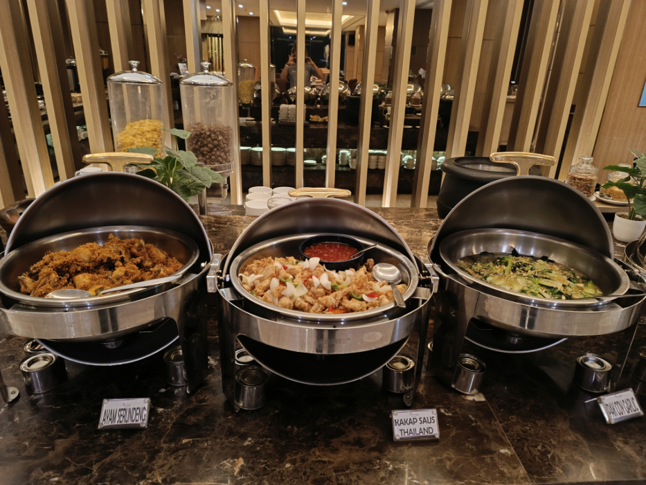 Habíamos escogido el hotel Orchardz bandara porque estaba cerca del aeropuerto, ofrecía traslado gratuito y servían el desayuno desde las 2.30 de la mañana. Eso nos vino muy bien porque nuestro vuelo salía a la intempestiva hora de 5.45 am. Como iba a ser la norma en los hoteles de Indonesia, la oferta del desayuno era muy asiática, pero conseguimos unas tostadas y una tortilla. Me encanta probar la cocina local pero no a esas horas…