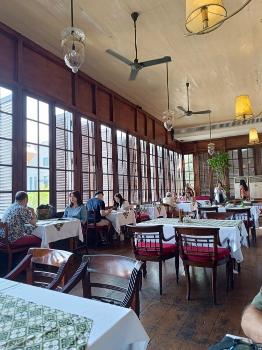 Aquí también se encuentra el Café Batavia, famoso por su ambiente y arquitectura colonial, así que aprovechamos para comer ahí. Nos gustó mucho el restaurante, tiene mucho encanto y la comida estaba bastante rica, aunque, lógicamente, era algo más caro que en los puestos locales. Depende de la hora, puede que tengas que esperar un poco si no has reservado con antelación, pero se aseguran de encontrarte una mesa más pronto o más tarde.