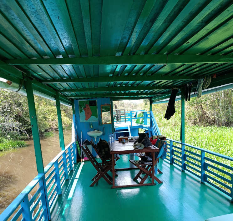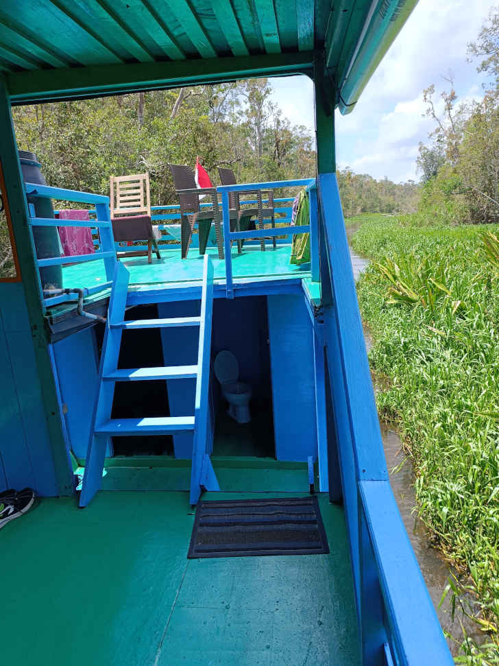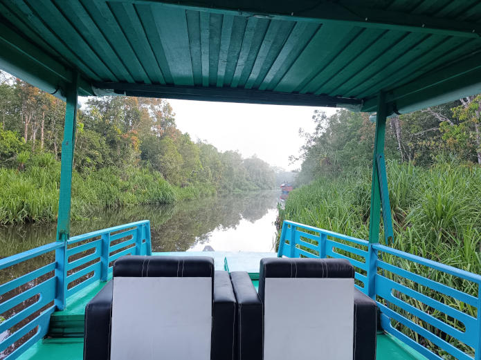 El término «klotok» con el que se llama a estos barcos tradicionales imita el sonido repetitivo del motor, que hace «klok-klok-klok» mientras surcan plácidamente el río Sekonyer. Dentro de los klotoks hay diferentes niveles de lujo, algunos incluso tienen AC, pero eso encarece mucho el precio y, realmente, no lo veo imprescindible. También se puede recorrer el río en lancha rápida y volver a pasar la noche en un hotel, pero no lo recomiendo porque, por un lado, pierdes el encanto de dormir bajo las estrellas y, por otro, con el ruido que hacen esas lanchas no vas a ver ningún animal por el camino, saldrán todos huyendo.