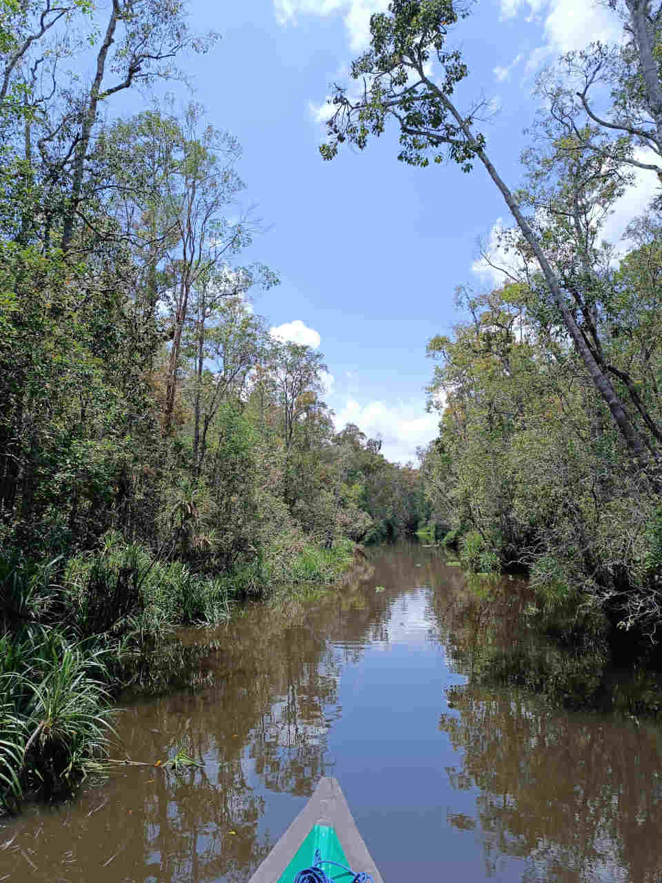 Volvimos a salir antes que el resto de klotoks y esta vez sí que conseguimos ver varios cocodrilos, algunos pequeñitos, pero también uno bien grande. Por la noche pudimos ver otro que parecía bastante grande, aunque solo podíamos ver sus ojos rojos con la linterna. Estos cocodrilos de agua salada, llamados cocodrilo poroso, son depredadores agresivos y a veces atacan a personas que se acercan demasiado al agua. No es muy común, pero yo por si acaso no me daría un baño en el río por mucho calor que haga.