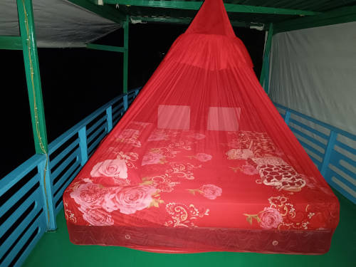 Después de cenar unas riquísimas gambas rebozadas y tallarines, nos prepararon una mosquitera en la cama, atracaron el klotok en una orilla y nos fuimos a dormir en la cubierta, mientras que el guía y la tripulación dormían en la parte de abajo.